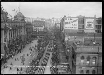 | Keywords: blackandwhite monochrome outdoor skyline city architecture photo border building black and white Parade of British sailors marching down lower Queen Street. On the left is the Chief Post Office decorated with bunting, the Union Jack, the flag of St George, and the illumination `Auckland greets you'. The advertising sign above the Thames Hotel (in the middle distance) reads `Annette Kellerman - Strand'; `The Spanish Dancer' - Lyric; etc . Other identifiable signs include R & W Hellaby Ltd, Sandford Ltd; Tropical Planters Ltd; New Zealand Insurance Co Ltd. Photograph taken by William A Price ca 1920. Inscriptions: Inscribed - Photographer's title on negative -bottom left: Fleet Week sailors marching down Queen St. Auckland. 11B. Quantity: 1 b&w original negative(s). Physical Description: Dry plate glass negative 4.5 x 6.5 inches Fleet Week sailors marching down Queen Street, Auckland. Price, William Archer, 1866-1948 :Collection of post card negatives. Ref: 1/2-001235-G. Alexander Turnbull Library, Wellington, New Zealand. natlib.govt.nz/records/22869564 Parade of British sailors marching down lower Queen Street. On the left is the Chief Post Office decorated with bunting, the Union Jack, the flag of St George, and the illumination `Auckland greets you'. The advertising sign above the Thames Hotel (in the middle distance) reads `Annette Kellerman - Strand'; `The Spanish Dancer' - Lyric; etc . Other identifiable signs include R & W Hellaby Ltd, Sandford Ltd; Tropical Planters Ltd; New Zealand Insurance Co Ltd. Photograph taken by William A Price ca 1920. Inscriptions: Inscribed - Photographer's title on negative -bottom left: Fleet Week sailors marching down Queen St. Auckland. 11B. Quantity: 1 b&w original negative(s). Physical Description: Dry plate glass negative 4.5 x 6.5 inches Fleet Week sailors marching down Queen Street, Auckland. Price, William Archer, 1866-1948 :Collection of post card negatives. Ref: 1/2-001235-G. Alexander Turnbull Library, Wellington, New Zealand. natlib.govt.nz/records/22869564 |