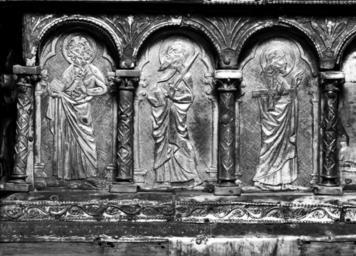 | Keywords: Flemish - Shrine of Saint Amandus - Walters 539 - Detail A.jpg This large church-shaped shrine once housed the relics of a 7th-century saint who served as a missionary and bishop to the western regions of present-day Belgium St Amandus d 679 also established a monastery at Elnon near Tournai western Belgium where the monks later commissioned this reliquary to honor his remains The shrine of St Amandus ornamented with silver columns and gilded apostles was the focus of a strong local cult visited by pilgrims who came for healing or in thanks for prayers answered Given its large size and popularity the shrine was probably placed upon a platform supported by columns behind the main altar for year-round veneration early 13th century with later additions Medieval wood oak gilded copper silver brass champlevé enamel cloisonné enamel rock crystal and semiprecious stones H at top of finials 19 1/4 x W 25 1/4 x D 11 15/16 in 48 9 x 64 14 x 30 32 cm accession number 53 9 22284 Brimo de Laroussilhe Paris date and mode of acquisition unknown Henri Daguerre Paris date and mode of acquisition unknown Henry Walters Baltimore September 3 1930 by purchase Walters Art Museum Henry Walters Acquired by Henry Walters 1930 Transcription In black enamel on gilt copper strips placed along the base of the roof-like lid IN ISTA CAPSA SVNT SEQVENTES RELIQ VIA E B EATI AMANDI EP ISCOPU S; Translation In this reliquary are the following relics of the blessed Bishop Amandus; Transcription In black enamel on gilt copper strip placed along the base of the roof-like lid PROESENTIS COMPOSITIVS Reliquaries and Ritual Medieval Objects of Devotion The Walters Art Gallery Baltimore 1984-1985 The Book of Kings Art War and the Morgan Library's Medieval Picture Bible The Walters Art Museum Baltimore; Academy of the Arts Easton Easton; Princeton University Art Museum Princeton; The Mitchell Gallery Annapolis; Williams College Museum of Art Williamstown 2002 The Special Dead A Medieval Reliquary Revealed The Walters Art Museum Baltimore 2008-2009 Treasures of Heaven The Cleveland Museum of Art Cleveland; The Walters Art Museum Baltimore; The British Museum London 2010-2011 place of origin Elnone Monastery in Tournai Belgium Walters Art Museum license Reliquary chest of Saint Amand Media contributed by the Walters Art Museum needs category review |