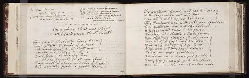 | Keywords: Flickr - Beinecke Flickr Laboratory - (Commonplace Book), (late 17th Century) (5).jpg Anonymous MS collection of poems and recipes The compiler was evidently a member of Cambridge University Collection includes bawdy and satirical verse mainly of a political anti-Popery and academic cast 88 p and 74 p of medical cookery and household recipes beginning with 2 p of directions for anglers Page/Caption 3v-4r late 17th century 1 volume 168 p 10 x 16 cm Subjects English poetry Latin poetry Cookery Medicine Fishing Genre Commonplace books Manuscripts Poems Cite as James Marshall and Marie-Louise Osborn Collection Beinecke Rare Book and Manuscript Library Yale University Repository http //www library yale edu/beinecke Beinecke Rare Book Manuscript Library Yale University Bibliographic Record Number 2031703 Call Number Osborn b115 http //www flickr com/photos/25923731 N05/2436870424/ Commonplace Book late 17th Century 2008-04-23 08 53 http //www flickr com/people/25923731 N05 Beinecke Flickr Laboratory PD-old Osborn b115 Beinecke Library |