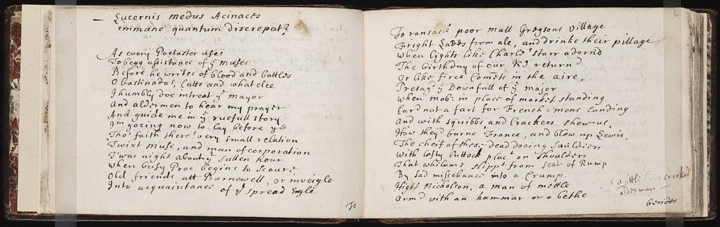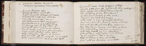 | Keywords: Flickr - Beinecke Flickr Laboratory - (Commonplace Book), (late 17th Century) (7).jpg Anonymous MS collection of poems and recipes The compiler was evidently a member of Cambridge University Collection includes bawdy and satirical verse mainly of a political anti-Popery and academic cast 88 p and 74 p of medical cookery and household recipes beginning with 2 p of directions for anglers Page/Caption 5v-6r late 17th century 1 volume 168 p 10 x 16 cm Subjects English poetry Latin poetry Cookery Medicine Fishing Genre Commonplace books Manuscripts Poems Cite as James Marshall and Marie-Louise Osborn Collection Beinecke Rare Book and Manuscript Library Yale University Repository http //www library yale edu/beinecke Beinecke Rare Book Manuscript Library Yale University Bibliographic Record Number 2031703 Call Number Osborn b115 http //www flickr com/photos/25923731 N05/2436051745/ Commonplace Book late 17th Century 2008-04-23 08 53 http //www flickr com/people/25923731 N05 Beinecke Flickr Laboratory PD-old Osborn b115 Beinecke Library |