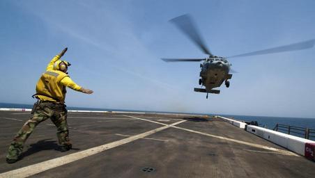 | Keywords: Flickr - Official U.S. Navy Imagery - A Sailor signals a helicopter to land on the deck..jpg ARABIAN SEA April 2 2012 Aviation Boatswain ™s Mate Handling 2nd Class Tanner Kent signals an MH-60S Sea Hawk helicopter assigned to the Golden Falcons of Helicopter Sea Combat Squadron HSC 12 to take off from the amphibious transport dock ship USS New Orleans LPD 18 during a cross deck evolution with the aircraft carrier USS Abraham Lincoln CVN 72 New Orleans and embarked Marines assigned to the 11th Marine Expeditionary Unit are deployed as part of the Makin Island Amphibious Ready Group supporting maritime security operations and theater security cooperation efforts in the U S 5th Fleet area of responsibility U S Navy photo by Mass Communication Specialist 2nd Class Dominique Pineiro/Released 120402-N-PB383-639 http //www flickr com/photos/usnavy/7050496099/ A Sailor signals a helicopter to land on the deck 2012-04-02 13 37 http //www flickr com/people/56594044 N06 Official Navy Page from United States of America Dominique Pineiro/U S Navy U S Navy photo PD-USGov-Military-Navy Official U S Navy Imagery http //flickr com/photos/56594044 N06/7050496099 2012-11-13 20 06 41 cc-by-2 0 Images from United States Navy to check |