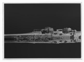 | Keywords: Flintlåsbössa av fransk-nederländsk typ ca 1650, stock av Johan Eberhart Sommer, Künzelsau - Livrustkammaren - 35331-negative.tif Publius Cornelius Scipio Africanus konsul plain text Rund slätborrad pipa av stål godstjocklek vid mynningen 0 8 mm Åttsidig kammaren vid övergången en smal ring kanterna fasade 12 mm bakom ringen vid pipbasen likaså en profilerad vulst på de tre övre faserna Därframför ett dekorfält i stålsnitt l 110 mm nästan hela fältet förgyllt baktill ett snäckliknande ornament med två nedhängande bladfestonger Därframför tre ryttare alla i rustning den i mitten barhuvad fas fältherrestav i h hand den h ryttaren har stav i v hand och fana i h den v ryttaren likaså fana båda hjälmklädda Ornamentfältet framtill avslutad med liknande snäckornament med bladfestonger kompletterade med bladknippe i mitten Rektangulärt svansskruvblad svagt böjt med bladdekor i stålsnitt <br/>Riktmedel Hjärtformigt sikte av förgylld mässing stolpkorn av mässing <br/>Fästning Pipan fäst med krysskruv underifrån dold av avtryckarblecket samt tre pipstift av stål <br/><br/>Flintlås med plant låsbleck delvis något fasade kanter dekor i stålsnitt på låsblecket bakom hanen ryttare i 1600-talsdräkt med fältherrestav i bakgrunden stad till h om hanen tillbakaseende fältherre till häst i bakgrunden tält S-formig platt hane med små rundade käkar överkäken lös graverad och punsad drakdekor rundat koniskt käkskruvhuvud hanskruv med huvud täckande hela hankroppen stålsnittsdekor i form av blomma Fängpanna med liten fals på gaveln sicksackdekor Batteri med rektangulärt eldstål med rundad överkant liten profilering nertill på ryggen Batterifjäder utan studel litet sexflikigt fjäderlöv Nöt utan studel <br/>Fästning Två låsskruvar <br/>C-formig avtryckare Rektangulärt avtryckarbleck <br/><br/>Helstock av valnöt med kolv av tidig fransk typ På kolvens h och undersida snidad dekor på h sida stridsscen täckande hela sidan ryttare i antikiserande rustningar och i förgrunden till v en på marken sittande skäggig krigare som stöttas av två krigare och framför honom en yngre man som håller en häst vid tygeln Längs nederkanten en inskuren latinsk text Scipio cui magnum dives dedit Affrica nomen // pugnantem ad Trebia litus mane patrem samt i ny spalt till h Eximit ingenti pressum discrimine belli // Iam puer et tuta sub statione locat Scipio som det rika Afrika gav ett stort namn giver redan såsom gosse den tidigt vid Trebias strand kämpande fadern ett säkert hägn och borttager honom från det genom ofantliga faror tryckande kriget Längst till höger signering Iohan EberHart // Somer Kolvens undersida svagt rundad två rektangulära fält båda med krigare i helfigur det bakre med en man sedd snett bakifrån huvudet profil h på huvudet ett lejonhuvud med manen hängande ner på ryggen antik rustning och kort mantel h hand håller i oval sköld v arm upplyft och håller i stav Herkules Det främre fältets man likaså sedd snett bakifrån huvudet profil v antik rustning med hjälm o plym ingen mantel gehäng med svärd v hand vilar på höften h håller en på marken stödd sköld Framför de två fälten en i bladverk övergående maskaron Hela stocken i övrigt dekorerad med rankverk av silvertråd med blad och blommor av graverade pärlmorplattor På anslaget i rankverket dessutom 17 fåglar av olika slag däribland en uggla och fem påfåglar i mitten en med uppfälld stjärt Belag av graverat silver bakplåt fäst med sju stålspikar runt spikarna samt mitt på bakplåten graverade blad Två släta rörkor samt näsband med blomdekor Varbygel av stål med korta släta armar främre stolpen kluben och främre armen har del även bakom stolpen litet flikigt löv baktill På bygeln en hillebardiär i låg relief <br/><br/>Tillbehör <br/>Laddstock av stockens trä l 1142 mm framtill skodd med silver l 27 mm med geometrisk dekor I andra änden spår av annat beslag original caption ca 1650 walnut e3 - eldvapen - stock material valnöt - steel e127 - eldvapen - pipa lås och stockbeslag material stål - silver thread e8 - eldvapen - stockdekor material silvertråd - silver e7 - eldvapen - stockbeslag material silver - mother-of-pearl e8 - eldvapen - stockdekor material pärlemor - brass e4 - eldvapen - riktmedel material mässing g 2520 size mm 1162 pipa size mm 1555 LRK Künstlerfamilie Sommer 1985 Scipio cui magnum dives dedit Affrica nomen // pugnantem ad Trebia litus mane patrem // Eximit ingenti pressum discrimine belli // Iam puer et tuta sub statione locat anv e3 - eldvapen - stock; Elin Thegerström Iohan EberHart // Somer anv e8 - eldvapen - stockdekor; Johan Eberhard Sommer Scipio cui magnum dives dedit Affrica nomen // pugnantem ad Trebia litus mane patrem // Eximit ingenti pressum discrimine belli // Iam puer et tuta sub statione locat anv e3 - eldvapen - stock; Elin Thegerström Iohan EberHart // Somer anv e8 - eldvapen - stockdekor; Johan Eberhard Sommer place of origin original filename LN_B07994_010874 55357 inventory number LRK 18794 35331 CC0 Flintlåsbössa av fransk-nederländsk typ ca 1650 stock av Johan Eberhart Sommer Künzelsau - Livrustkammaren - 35331 tif <gallery caption Different images of same object > File Flintlåsbössa av fransk-nederländsk typ ca 1650 stock av Johan Eberhart Sommer Künzelsau - Livrustkammaren - 43890 tif File Flintlåsbössa av fransk-nederländsk typ ca 1650 stock av Johan Eberhart Sommer Künzelsau - Livrustkammaren - 81541 tif File Flintlåsbössa av fransk-nederländsk typ ca 1650 stock av Johan Eberhart Sommer Künzelsau - Livrustkammaren - 64420 tif File Flintlåsbössa av fransk-nederländsk typ ca 1650 stock av Johan Eberhart Sommer Künzelsau - Livrustkammaren - 72982 tif File Flintlåsbössa av fransk-nederländsk typ ca 1650 stock av Johan Eberhart Sommer Künzelsau - Livrustkammaren - 77798 tif File Flintlåsbössa av fransk-nederländsk typ ca 1650 stock