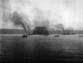 | Keywords: Floating centre span downstream, Quebec Bridge, Quebec City, QC, 1916.jpg en Photograph Floating centre span downstream Quebec Bridge Quebec City QC 1916 Silver salts on paper - Gelatin silver process - 19 x 24 cm fr Photographie Travée centrale flottante en aval pont de Québec Québec QC 1916 Gélatine argentique 19 x 24 cm<br> « Il y a 100 ans ¦ dans la presse québécoise<br> 6 septembre 1916 Les ouvriers menacent de faire grève pour la pose de la travée centrale du Pont de Québec<br> Le moment est attendu avec autant d ™impatience que de fébrilité Le 11 septembre 1916 le Pont de Québec devrait prendre son allure définitive avec la pose de la travée centrale Un travail colossal que le journal « La Patrie » décrit comme « l ™entreprise la plus hasardeuse qu ™ait encore conçu le génie civil en notre pays et c ™est aussi l ™une des plus périlleuses » Il convient de rappeler que cette « énorme masse de fer » pèse 7 000 tonnes Afin de faciliter la pose ouvriers et ingénieurs profiteront de la marée haute lorsque la travée « solidement assise sur ses pontons flottants » sera placée sous le pont et prête à être élevée et placée « aussi rapidement que possible afin de profiter de l ™Ã©tale de la marée haute qui ne dure environ que 45 minutes » <br> Les esprits ont encore en mémoire le drame de 1907 alors que la partie sud du pont s ™Ã©tait effondrée coûtant la vie à 76 ouvriers Neuf ans plus tard les ouvriers ont bien conscience du danger qui les attend ce 11 septembre lors de la pose de la travée centrale et ils n ™entendent plus courir de tels risques pour un salaire de misère Aussi ont-ils menacé de grève les exploitants du pont si leur salaire ne passe pas à 10 de l ™heure « La Patrie » explique que « ceux qui ont été choisis ont réalisé que l ™entreprise était extraordinairement périlleuse et ils veulent être payés en conséquence Ils demandent maintenant 10 de l ™heure et de plus si l ™entreprise réussit et si la travée centrale est heureusement placée un bonus d ™au moins 200 chacun <br> Jusqu ™Ã présent la Compagnie ne consent qu ™Ã doubler la paie de ses hommes ce jour-là Mais ceux-ci trouvent que étant donné les risques considérables de l ™entreprise l ™offre n ™est pas du tout satisfaisante »<br> Compte tenu de la situation et de l ™attente extrême du public « La Patrie » conçoit qu ™il soit « possible que l ™on finisse par s ™entendre » Cet engouement pour la nouvelle construction est telle qu ™Ã 5 jours de l ™Ã©vénement « à peu près tous les navires qui sont dans le port de Québec et qui seront disponibles ce jour-là sont loués et nolisés » Les compagnies de tramways de Lévis et de Québec ont même décidé d ™Ã©tablir pendant toute la nuit un service toutes les quinze minutes » “ https //www facebook com/100346696735784/photos/a 114831705287283 11432 100346696735784/795041157266331/ type 3 theater facebook com 1916 VIEW-5668 1 Wm Notman Son other versions PD-old-70-1923 Quebec Bridge 1916 in Quebec City September 1916 in Canada |