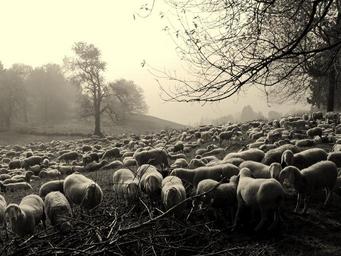 Keywords: flock dark sheep animals trees branches fog mist
