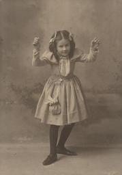 | Keywords: children portraits people monochrome Photographer: Reuben R. Sallows (1855 - 1937) Description: Full length studio portrait of small girl posed in dance position with arms up-raised; short light-coloured dress with puffed sleeves, lace front, sash at waist from which hangs draw-string purse; dark tights and shoes; light bows in hair; Sallows imprint in lower right corner of matte; writing on back identifies subject as Floe Sallows Saunders Object ID : 0374-rrs-ogohc-ph View additional photographs by Sallows that are held in other collections at the Reuben R. Sallows Digital Library. Order a higher-quality version of this item by contacting the Huron County Museum (fee applies). Photographer: Reuben R. Sallows (1855 - 1937) Description: Full length studio portrait of small girl posed in dance position with arms up-raised; short light-coloured dress with puffed sleeves, lace front, sash at waist from which hangs draw-string purse; dark tights and shoes; light bows in hair; Sallows imprint in lower right corner of matte; writing on back identifies subject as Floe Sallows Saunders Object ID : 0374-rrs-ogohc-ph View additional photographs by Sallows that are held in other collections at the Reuben R. Sallows Digital Library. Order a higher-quality version of this item by contacting the Huron County Museum (fee applies). |