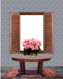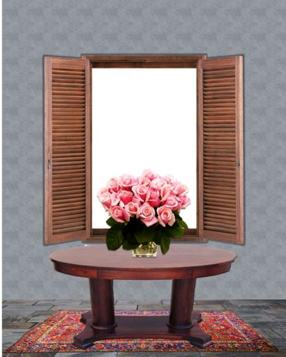 Keywords: floor wall rug carpet area table wood round antique bouquet roses flowers vase window shutters room environment view interior design decor