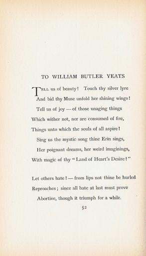 | Keywords: Florence Earle Coates Mine and Thine 1904 052.jpg Florence Earle Coates Mine and Thine 1904 051 jpg Florence Earle Coates Mine and Thine 1904 053 jpg To William Butler Yeats; p 52 of Mine and Thine 1904 by Philadelphia poet Florence Earle Coates 1850-1927 First line Tell us of beauty Touch thy silver lyre A scan of p 52 Florence Earle Coates 1904 None/copyright expired PD-old Florence Earle Coates Mine and Thine 1904 | ||||