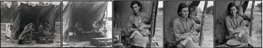 Keywords: Florence Owens Thompson montage by Dorothea Lange.jpg Destitute pea pickers in California Mother of seven children Age thirty-two en Nipomo California In the 1930s the FSA employed several photographers to document the effects of the Great Depression on Americans Many of the photographs can also be seen as propaganda images to support the U S government's policy distributing support to the worst affected poorer areas of the country en Dorothea Lange's image of a migrant pea picker en Florence Owens Thompson and her family has become an icon of resilience in the face of adversity Lange actually took six images that day the last being the famous Migrant Mother This is a montage of the other five pictures Persons in picture left to right are Viola Pete in rocker age 14 standing inside tent; Ruby age 5; Katherine age 4 seated on box; Florence age 32 and infant Norma age 1 year being held by Florence Pete has moved inside the tent and away from Lange in hopes her photo can not be taken Katherine stands next to her mother Florence is talking to Ruby who is hiding behind her mother as Lange took the picture Florence is nursing Norma Katherine has moved back from her mother as Lange approached to take this shot Ruby is still hiding behind her mother Left to right are Florence Ruby and baby Norma Florence stopped nursing Norma and Ruby has come out from behind her This photograph was the one used by the newspapers the following day to report the story of the migrants Portrait shows en Florence Owens Thompson with several of her children in a photograph known as Migrant Mother Altered from the images on this webpage http //memory loc gov/ammem/awhhtml/awpnp6/migrant_mother html Migrant Mother en Library of Congress Prints and Photographs Division reproduction number LC-DIG-fsa-8b29516 Transferred from http //en wikipedia org en wikipedia; Transfer was stated to be made by User Ragesoss February/March 1936 2006-07-12 original upload date Creator Dorothea Lange Original uploader was Esemono at http //en wikipedia org en wikipedia PD-USGov original upload log page en wikipedia MigrantMother jpg 2006-07-12 12 13 Esemono 1827×333×8 218163 bytes <nowiki> See also Image Lange-MigrantMother jpg Image Lange-MigrantMother02 jpg Farm Security Administration images Memorable photographs United States history images Altered from the images on this webpage </nowiki> Florence Owens Thompson Dorothea Lange