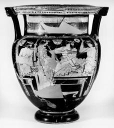 | Keywords: Florence Painter - Column Krater Depicting Symposiasts and a Satyr Dancing with Youths - Walters 4866 - Side A.jpg This red-figure column-krater depicts a symposium with three men on klinai and girl playing auloi On the left a bearded man lies on a kline chest frontal head to the right Only his upper half and half of the kline are shown He has a mantle draped around his left shoulder and waist and wears a thick fillet and wreath He gestures to his fellow banqueters Beneath him a table is visible and above on the wall on the left hangs a basket with covering cloth and on the right a flute case To the right is a girl playing auloi in chiton mantle thick fillet and wreath who stands in profile to the right playing auloi A bearded man and a youth lie on the next kline Both wear mantles thick fillets and wreaths in a fashion similar to the first two figures The man holds a phiale in his right hand and turns his head to the right towards the youth who faces and gestures toward him; a small kylix in black hangs from the right index finger of the youth Beneath them a table and footstool are visible; hanging above from left to right are a basket with covering cloth and a kylix All three support themselves by resting their left elbows on cushions The back depicts an old man dancing and two youths In the center a bearded balding potbellied man advances to the right as if dancing He raises his left foot high off the ground holds a stick in the air above his head in his right hand and extends his left hand out holding a mantle which is wrapped around his back and shoulders He wears a wreath and thick fillet and appears to have a string possibly an amulet around his right forearm On the left a mantled youth goes left looking around a staff in his right hand On the right another mantled youth moves left holding a staff out in his right hand The two youths have fillets ca 460 450 BC Classical terracotta cm 48 2 36 7 h x max diam ; at mout cm 37 4 diam ; at rim cm 18 8 diam accession number 48 66 1243 Don Marcello Massarenti Collection Rome date and mode of acquisition unknown cat no 208 Henry Walters city Baltimore Walters Art Museum Henry Walters Acquired by Henry Walters with the Massarenti Collection 1902 place of origin Attica Greece Walters Art Museum license Ancient Greek red-figure pottery in the Walters Art Museum Florence Painter Media contributed by the Walters Art Museum needs category review Media contributed by the Walters Art Museum needs artist update Auloi in ancient Greek pottery Hetaeras at symposium in ancient Greek pottery |