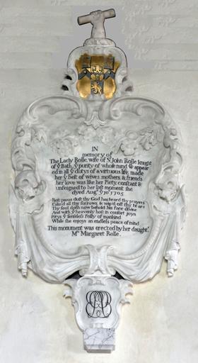 Keywords: FlorenceRolle1705TawstockDevon.JPG Mural monument to Florence Rolle Lady Rolle d 1705 wife of Sir John Rolle d 1706 Tawstock Church Devon By Thomas Jewell of Barnstaple Pevsner Nikolaus Cherry Bridget The Buildings of England Devon London 2004 p 790 Mural monument to Florence Rolle d 1705 daughter and sole heiress of Denys Rolle 1614-1638 of Stevenstone Devon and wife of Sir John Rolle d 1706 of Marhayes Cornwall Tawstock Church Devon The arms are Rolle of Marhayes with inescutcheon of pretence of Rolle of Stevenstone own photo 2013 Lobsterthermidor <span class signature-talk >talk</span> 11 33 10 April 2013 UTC Wall mounted church monuments in Devon St Peter's Church Tawstock interior Thomas Jewell of Barnstaple Rolle arms |