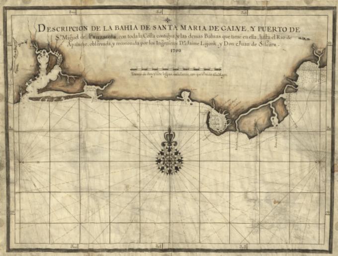 | Keywords: Florida-Panzacola-map-Bahia-de-Santa-Maria-de-Galve-1700-full.gif Florida map dated 1700 in Spanish of the Pensacola Florida Pensacola area labeled as the Bay of Santa Maria de Galve and Port of San Miguel de Panzacola with the contiguous coast and other bays up to the river of Apalache Along the left coast is Santa Rosa Island labeled as Punta de Siguenza on Isla de Santa Rosa Rofa ; left of the island is of the Bay of Saint Mary of Galve and Port of St Michael of Panzacola with the total contiguous coast and the other Bays contained in her up to the River of Apalache observed and reconoitered by the engineers Mr Jaime Lajonk and Mr John de Siscara The word Panzacola is also Panza-cola meaning belly-tail Legend of 17 units Tronco de dies y siete leguas castellanas con que se mide este Mapa translated Trunk of 17 leagues Castillian whereupon is measured this Map the word dies is treated as diez meaning ten Channel at right Este Rio es navegable para lanchas y canoas y tiene quatro vocas como se ve translated This River is navigable for boats and canoes and has four mouths as it is seen the word quatro is treated as cuatro meaning four Left margin handwriting Francia / España / Rio de los perdidos translated France / Spain / River of the lost ones The Perdido River marked the boundary between Louisiana New France French Louisiana and Florida Spanish Florida General words Bahia is Bay Rio is River Punta is Point and Sta is Santa Saint The top section of the map is enlarged as 1 5- mb file en Image Florida-Panzacola-map-Bahia-de-Santa-Maria-de-Galve-1700-top-half-enlarged gif which shows the top 60 of the map but in much greater detail Via Source URL U S Library of Congress webpage http //rs6 loc gov/cgi-bin/map_item pl data /home/www/data/gmd/gmd393/g3932/g3932f/lh000870 sid itemLink r ammem/gmd field NUMBER+ band g3932f+lh000870 title Descripcion+de+la+Bahia+de+Santa+Maria+de+Galve +y+Puerto+de+Sn +Miguel+de+Panzacola+con+toda+la+costa+contigua+y+las+demas+bahias+que+tiene+en+ella +hasta+el+Rio+de+Apalache+/+observada +y+reconozida+por+los+ingenieros+Dn +Jaime+Lajonk +y+Don+Juan+de+Siscara style gmd legend map was downloaded as zoomed sections of the map and combined The image is from a photograph of the map dated 1700 on the full map 306 years old in the public domain 1700 los Ingenieros Dn Jaime Lajonk y Don Juan de Siscara page is/was http //en wikipedia org/w/index php title Image 3AFlorida-Panzacola-map-Bahia-de-Santa-Maria-de-Galve-1700-full gif here All following user names refer to en wikipedia 2007-01-14 01 28 Wikid77 494×374× 167096 bytes <nowiki>Florida map dated 1700 in Spanish of the Pensacola area labeled as the Bay of Santa Maria de Galve and Port of San Miguel de Panzacola with the contiguous coast and other bays up to the river of Apalache Along the left coa</nowiki> Colonial Florida 1700 History of Pensacola Maps in Spanish |