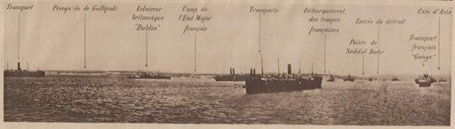 | Keywords: Flotte alliée et débarquement dans les Dardanelles 1915.jpg fr Vue de la flotte alliée devant le détroit des Dardanelles en mai 1915 Photographie publiée par l ™hebdomadaire Le Miroir le 23 mai 1915 en For the allied fleet to the Dardanelles in May 1915 Photograph published by the weekly Le Miroir 23 May 1915 Translation from left to right transport ship Gallipoli Peninsula British scout ship Dublin the French camp staff transport ships landing French troops Seddul Bahr entrance of the Dardanelles the French ship Gange Asia coast 1915 http //gallica bnf fr/ark /12148/bpt6k65228092 image Gallica fr author anonymous-EU PD-US-1923 Uploaded with UploadWizard Battle of Gallipoli Naval operations in the Dardanelles Campaign World War I forces of France at Gallipoli Le Miroir World War I |