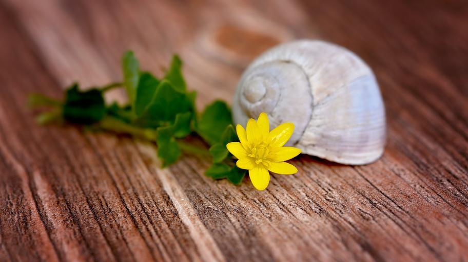 Keywords: flower blossom bloom yellow celandine shell empty empty snail shell wood close