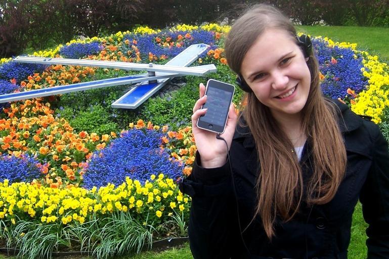 Keywords: Flower clock Audioguide.jpg en Audioguide user in Ventspils near one of the most popular sightseeing objects - Flower clock own SIA AudioGids Clocks in Latvia Flower clocks Ventspils Audioguides