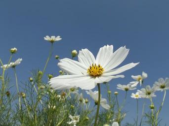 Keywords: flower cosmos blossom blooming plant spring summer flora nature blue sky beautiful white yellow macro
