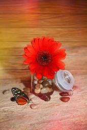 Keywords: flower gerbera blossom bloom plant red decorative stones decorative glass butterfly wood deco decoration decorative text freedom