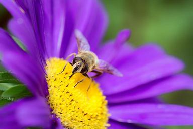 Keywords: flower marguerite purple violet blossom bloom purple flower pistil bee insect animal nature close flight insect