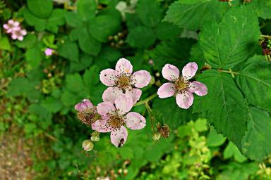 Keywords: flower plant bloom pistil petal leaf garden insect insect on petal pink green bright sunlight summer