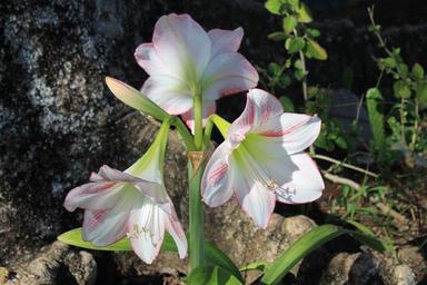 Keywords: flower plant blossom bloom amaryllis star wild nature green stalk funnel winter pink white stamens pollen tropical warm sun