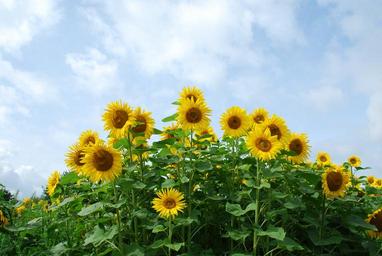 Keywords: flower plant sun flower bees summer late summer field agriculture sky nature clouds arable fields sun yellow bright harvest