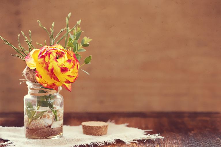 Keywords: flower ranunculus red yellow vase glass deco decoration flower vase spring flower schnittblume close text freedom negative space
