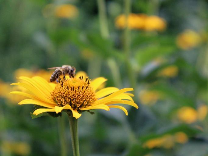Keywords: flower yellow blossom bloom yellow flower close nature plant bright petals garden summer landscape colorful bloom beautiful flora wasp animal insect animal world flight insect wing sting