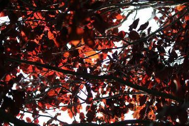 Keywords: flowering plum tree tree plum leaf leaves red sky summer looking up through leaves day back lit sunlight branches branch sunshine sun daylight daytime fall colors fall