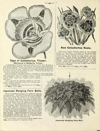 Keywords: Flowers (15830505883).jpg Type of Calochortus Flower <br> Mariposa or Butterfly Tulips <br> A remarkably brilliant class of California bulbs with flowers in <br> The richest combinations ; for winter blooming in the house they <br> gi e great pleasure Four or six bulbs are recommended for use in <br> a five inch pot or bos They are very easily grown cared for in <br> the same manner as Hyacinths in pots When in bloom they are <br> very showy and last a long time <br> The exquisitely moulded flowers resemble in form the Tulip <br> while the colors Are vivid and intense blotched and marked like <br> the butterfly's wing in crimson cream white i <br> yellow buff violet rose lemon brown salmon <br> and pink <br> They can also be planted outside in the fall <br> Cover slightly with Utter and they bloom beau- <br> tifully in early spring <br> New Calochortus Vesta <br> This very clearly marked strain is not related <br> to any of the others I consider it the finest of all <br> Calochorti The immense flowers three to five <br> inches across are borne on long stocks and are <br> numerous Petals broad fan-shaped with hairv <br> gland across base and a broad eye and band across <br> middle Color white suffused 'with lilac to rose <br> purple Center red Back of petal purple It grows <br> m any soil from heavy wet clay to light loam and is <br> not subject to disease <br> Price Sc each 3 for J 2c ; Doz 35c <br> Mixed varieties all colors and forms <br> for 10c ; 12 for 5c <br> for 5c <br> Japanese Hanging Fern Balls <br> These fern balls are going to be quite the rage the <br> coming season The fern fronds are woven together <br> like rattan into a ball some 6 to 8 inches through <br> They come from Japan in a dry dormant state <br> When ready to start them dip them in tepid water <br> for 4 or 6 hours then hang them in a rather warm <br> place and water them by dipping each day for a <br> week or so Then see that they have enough water <br> by sprinkling Soon the young ea es Mill begin to <br> start and continue until the bail is completely <br> enveloped with most beautiful foliage They are a <br> beautiful and unique ornament showing the skill <br> of the Japanese in connection with the beautiful <br> plant growth They are suspended from the ceiling <br> like hanging baskets and give a fairy-like effect <br> For piazza in summer they are very beautiful sus- <br> pended from the roof with fine wire <br> Pri-e of frashly imported Fern Balls largest size <br> 75c each ; prepaid by express or mail <br> Japanese Hanging Fern BalL 43800641 148987 77812 Text http //www biodiversitylibrary org/page/43800641 1900 Henry G Gilbert Nursery and Seed Trade Catalog Collection ; Miss Mary E Martin Firm ; Miss Mary E Martin Firm NameFound Calochortus NameConfirmed Calochortus EOLID 45417 NameBankID 2662473 NameFound Mariposa NameConfirmed Mariposa NameBankID 4232456 Biodiversity Heritage Library Flowers Christmas Easter midwinter and spring Garden Stories Catalogs Flowers Miss Mary E Martin Firm Nurseries Horticulture Seeds U S Department of Agriculture National Agricultural Library bhl page 43800641 dc identifier http //biodiversitylibrary org/page/43800641 bhlGardenStories Calochortus Fern BHLinbloom miss mary e martin firm nurseries horticulture u s department of agriculture national agricultural library bhlgardenstories bhlinbloom Information field Flickr posted date ISOdate 2015-02-05 CC-BY-2 0 BioDivLibrary https //flickr com/photos/61021753 N02/15830505883 2015-08-25 00 55 32 cc-by-2 0 PD-old-70-1923 Miss Mary E Martin Firm seed catalog Photos uploaded from Flickr by Fæ using a script