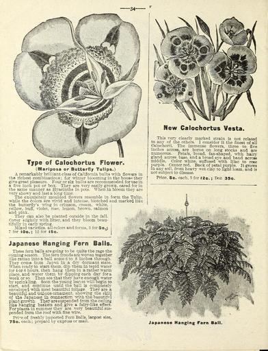 | Keywords: Flowers (15830505883).jpg Type of Calochortus Flower <br> Mariposa or Butterfly Tulips <br> A remarkably brilliant class of California bulbs with flowers in <br> The richest combinations ; for winter blooming in the house they <br> gi e great pleasure Four or six bulbs are recommended for use in <br> a five inch pot or bos They are very easily grown cared for in <br> the same manner as Hyacinths in pots When in bloom they are <br> very showy and last a long time <br> The exquisitely moulded flowers resemble in form the Tulip <br> while the colors Are vivid and intense blotched and marked like <br> the butterfly's wing in crimson cream white i <br> yellow buff violet rose lemon brown salmon <br> and pink <br> They can also be planted outside in the fall <br> Cover slightly with Utter and they bloom beau- <br> tifully in early spring <br> New Calochortus Vesta <br> This very clearly marked strain is not related <br> to any of the others I consider it the finest of all <br> Calochorti The immense flowers three to five <br> inches across are borne on long stocks and are <br> numerous Petals broad fan-shaped with hairv <br> gland across base and a broad eye and band across <br> middle Color white suffused 'with lilac to rose <br> purple Center red Back of petal purple It grows <br> m any soil from heavy wet clay to light loam and is <br> not subject to disease <br> Price Sc each 3 for J 2c ; Doz 35c <br> Mixed varieties all colors and forms <br> for 10c ; 12 for 5c <br> for 5c <br> Japanese Hanging Fern Balls <br> These fern balls are going to be quite the rage the <br> coming season The fern fronds are woven together <br> like rattan into a ball some 6 to 8 inches through <br> They come from Japan in a dry dormant state <br> When ready to start them dip them in tepid water <br> for 4 or 6 hours then hang them in a rather warm <br> place and water them by dipping each day for a <br> week or so Then see that they have enough water <br> by sprinkling Soon the young ea es Mill begin to <br> start and continue until the bail is completely <br> enveloped with most beautiful foliage They are a <br> beautiful and unique ornament showing the skill <br> of the Japanese in connection with the beautiful <br> plant growth They are suspended from the ceiling <br> like hanging baskets and give a fairy-like effect <br> For piazza in summer they are very beautiful sus- <br> pended from the roof with fine wire <br> Pri-e of frashly imported Fern Balls largest size <br> 75c each ; prepaid by express or mail <br> Japanese Hanging Fern BalL 43800641 148987 77812 Text http //www biodiversitylibrary org/page/43800641 1900 Henry G Gilbert Nursery and Seed Trade Catalog Collection ; Miss Mary E Martin Firm ; Miss Mary E Martin Firm NameFound Calochortus NameConfirmed Calochortus EOLID 45417 NameBankID 2662473 NameFound Mariposa NameConfirmed Mariposa NameBankID 4232456 Biodiversity Heritage Library Flowers Christmas Easter midwinter and spring Garden Stories Catalogs Flowers Miss Mary E Martin Firm Nurseries Horticulture Seeds U S Department of Agriculture National Agricultural Library bhl page 43800641 dc identifier http //biodiversitylibrary org/page/43800641 bhlGardenStories Calochortus Fern BHLinbloom miss mary e martin firm nurseries horticulture u s department of agriculture national agricultural library bhlgardenstories bhlinbloom Information field Flickr posted date ISOdate 2015-02-05 CC-BY-2 0 BioDivLibrary https //flickr com/photos/61021753 N02/15830505883 2015-08-25 00 55 32 cc-by-2 0 PD-old-70-1923 Miss Mary E Martin Firm seed catalog Photos uploaded from Flickr by Fæ using a script |