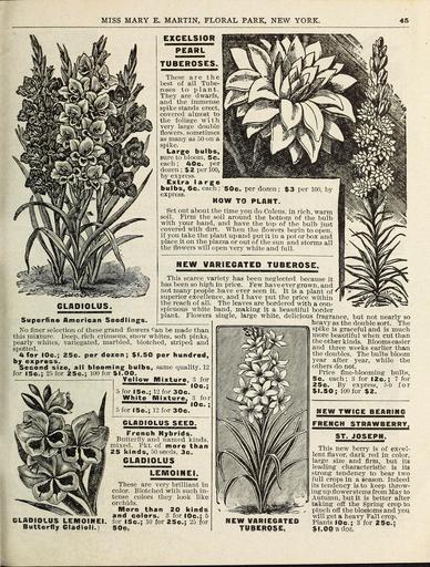 | Keywords: Flowers (15830533563).jpg MISS MARY E MARTIN FLORAL PARK NEW YORK <br> 45 <br> Superfine American Seedlings <br> EXCELSIOR <br> PEARL <br> TUBEROSES <br> These are the <br> best of all Tube- <br> roses to plant <br> They are dwarfs <br> and the immense <br> spike stands erect <br> covered almost to <br> the foliage with <br> very large double <br> flowers sometimes <br> as many as 50 on a <br> spike <br> Large bulbs <br> sure to bloom 5c <br> each ; 40c per <br> dozen; 2 per 100 <br> by express <br> Extra large <br> bulbs 6c each; <br> express <br> HOW TO PLANT <br> Set out about the time vou do Coletis in rich warm <br> soil Firm the soil around the bottom of the bulb <br> with your hand and have the top of the bulb just <br> covered with dirt When the flowers begin to open <br> if you take the plant up and put it in a pot or box and <br> place it on the piazza or out of the sun and storms all <br> the flowers will open very white and full <br> NEW VARIEGATED TUBEROSE <br> No finer selection of these grand flowers Can be made than <br> this mixture Deep rich crimsons snow whites soft pinks <br> pearly whites variegated marbled blotched striped and <br> spotted <br> 4 for 10c; 25c per dozen; 1 50 per hundred <br> by express <br> Second size all blooming bulbs same quality 12 <br> for I5c; 25 for 25c; 100 for 1 00 <br> Yellow Mixture 3 for <br> 10c; <br> This scarce variety has been neglected because it <br> has been so high in price Few have ever grown and <br> not many people have ever seen it It is a plant of ' <br> superior excellence and I have put the price within <br> the reach of all The leaves are bordered with a con- <br> spicuous white band making it a beautiful border <br> plant Flowers single large white delicious fragrance but not nearly so <br> heavy as the double sort The <br> spike is graceful and is much <br> 5 for 15c; 12 for 30c <br> White Mixture <br> 5 for 15c; 12 for 30c <br> for <br> 10c <br> <br> GLADIOLUS LEMOINEI <br> Butterfly Gladioli <br> GLADIOLUS SEED <br> French Hybrids <br> Butterfly and named kinds <br> mixed Pkt of more than <br> 25 kinds 50 seeds 3c <br> GLADIOLUS <br> LEMOINEI <br> These are very brilliant in <br> color Blotched with such in- <br> tense colors they look like <br> orchids <br> More than 20 kinds <br> and colors 3 for fOc; 5 <br> for 15c; 10 for 25c 25 for <br> 50C <br> more beautiful when cut than <br> the other kinds Blooms easier <br> and three weeks earlier than <br> the doubles The bulbs bloom <br> year after year while the <br> others do not <br> Price fine-blooming bulbs <br> 5c each; 3 for 12c; 7 for <br> 25c Bv express 5 for <br> 1 50; 100 for 2 <br> NEW TWICE BEARING <br> FRENCH STRAWBERRY <br> IEW VARIEGATED <br> TUBEROSE <br> ST JOSEPH <br> This new berry is of excel- <br> lent flavor dark red in color <br> large size and firm but its <br> leading characteristic is its <br> strong tendency to bear two <br> full crops in a season Indeed <br> its tendency is to keep throw- <br> ing up flower stems from May to <br> Autumn but it is better after <br> taking off the Spring crop to <br> pinch off the blossoms and you <br> will get a heavy Fall crop <br> Plants IOc; 3 for 25c; <br> Sl OOadoz 43800652 148987 77812 Text http //www biodiversitylibrary org/page/43800652 1900 Henry G Gilbert Nursery and Seed Trade Catalog Collection ; Miss Mary E Martin Firm ; Miss Mary E Martin Firm NameFound Gladiolus lemoinei NameConfirmed Gladiolus lemoinei EOLID 491576 NameBankID 2662851 Biodiversity Heritage Library Flowers Christmas Easter midwinter and spring Garden Stories Catalogs Flowers Miss Mary E Martin Firm Nurseries Horticulture Seeds U S Department of Agriculture National Agricultural Library bhl page 43800652 dc identifier http //biodiversitylibrary org/page/43800652 bhlGardenStories Gladiolas Tuberoses BHLinbloom miss mary e martin firm nurseries horticulture u s department of agriculture national agricultural library bhlgardenstories bhlinbloom Information field Flickr posted date ISOdate 2015-02-05 CC-BY-2 0 BioDivLibrary https //flickr com/photos/61021753 N02/15830533563 2015-08-25 00 51 08 cc-by-2 0 PD-old-70-1923 Miss Mary E Martin Firm seed catalog Photos uploaded from Flickr by Fæ using a script |