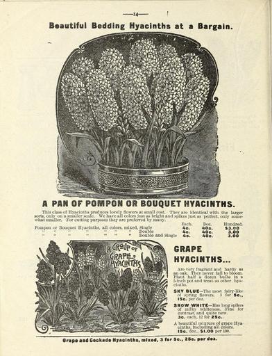 Keywords: Flowers (16448787031).jpg Beautiful Bedding Hyacinths at a Bargain <br> A PAN OF POMPON OR BOUQUET HYACINTHS <br> sorts <br> what smaller <br> This class of Hyacinths produces lovely flowers at small cost They are identical with the larger <br> s only on a smaller scale We have all colors just as bright and spikes just as perfect only some- <br> it smaller For cutting purposes they are preferred hy many <br> Each Doz Hundred <br> Pompon or Bouquet Hyacinths all colors mixed Single 4c 40c 3 00 <br> Double 4c 40c 3 00 <br> Double and Single 4c 40c 3 00 <br> GRAPE <br> HYACINTHS <br> Are very fragrant and hardy as <br> an oak They never fail to bloom <br> Plant half a dozen bulbs in a <br> 5-inch pot and treat- as other hya- <br> cinths <br> SKY BLUE ” The most fairy-like <br> of spring flowers 3 for 5c <br> 15c per doz <br> SNOW WHITE ” Has long spikes <br> of milky whiteness Fine for <br> contrast and quite new <br> 3c each 12 for 25c <br> A beautiful mixture of grape Hya- <br> cinths including all colors <br> 15c doz 1 00 per 100 <br> Crape and Cockade Hyacinths mixed 3 for 5c 25c per dez 43800619 148987 77812 Page 14 Text http //www biodiversitylibrary org/page/43800619 1900 Henry G Gilbert Nursery and Seed Trade Catalog Collection ; Miss Mary E Martin Firm ; Miss Mary E Martin Firm Biodiversity Heritage Library Flowers Christmas Easter midwinter and spring Garden Stories Catalogs Flowers Miss Mary E Martin Firm Nurseries Horticulture Seeds U S Department of Agriculture National Agricultural Library bhl page 43800619 dc identifier http //biodiversitylibrary org/page/43800619 bhlGardenStories Bouquet Hyacinths Grape Hyacinths Bulbs Plants BHLinbloom miss mary e martin firm nurseries horticulture u s department of agriculture national agricultural library bhlgardenstories bouquet hyacinths grape hyacinths bulbs plants bhlinbloom Information field Flickr posted date ISOdate 2015-02-05 CC-BY-2 0 BioDivLibrary https //flickr com/photos/61021753 N02/16448787031 2015-08-25 00 54 12 cc-by-2 0 PD-old-70-1923 Miss Mary E Martin Firm seed catalog Photos uploaded from Flickr by Fæ using a script |
