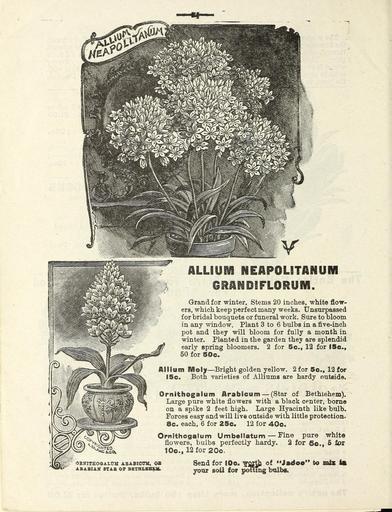 | Keywords: Flowers (16450557705).jpg ALLIUM NEAPOLITAN UN <br> GRANDIFLORUM <br> Grand for winter Stems 20 inches white flow- <br> ers which keep perfect many weeks Unsurpassed <br> for bridal bouquets or funeral work Sure to bloom <br> in any window Plant 3 to 6 bulbs in a five-inch <br> pot and they will bloom for fully a month in <br> winter Planted in the garden they are splendid <br> early spring bloomers 2 for 5e f 12 for I5e <br> 50 for SOe <br> Ail iuni 1 8 ©ly ” Bright golden yellow 2 for 5c 12 for <br> 15c Both varieties of Alliums are hardy outside <br> Ornithogalum Arabicum ” Star of Bethlehem <br> Large pure white flowers with a black center borne <br> on a spike 2 feet high Large Hyacinth like bulb <br> Forces easy and will live outside with little protection <br> 8c each 6 for 25c 12 for 40o <br> Ornithogalum Umbellatum ” Fine pure white <br> flowers bulbs perfectly hardy 2 for 6c 5 tor <br> 10c 12 for 20c <br> ORKIf EOGALUK ASABICtm OS <br> ABASIAS iT4B © SSTHLBBSlfc <br> Send for 10c TOfJJi ° Jadoo <br> yotur soil tow potting bulbs <br> to mix la 43800631 148987 77812 Text http //www biodiversitylibrary org/page/43800631 1900 Henry G Gilbert Nursery and Seed Trade Catalog Collection ; Miss Mary E Martin Firm ; Miss Mary E Martin Firm NameFound ALLIUM NameConfirmed Allium EOLID 11378177 NameBankID 2662323 NameFound Arabicum NameFound Ornithogalum NameConfirmed Ornithogalum L EOLID 29231 NameFound Umbellatum Biodiversity Heritage Library Flowers Christmas Easter midwinter and spring Garden Stories Catalogs Flowers Miss Mary E Martin Firm Nurseries Horticulture Seeds U S Department of Agriculture National Agricultural Library bhl page 43800631 dc identifier http //biodiversitylibrary org/page/43800631 bhlGardenStories Allium neopolitanum grandiflorum BHLinbloom miss mary e martin firm nurseries horticulture u s department of agriculture national agricultural library bhlgardenstories bhlinbloom Information field Flickr posted date ISOdate 2015-02-05 CC-BY-2 0 BioDivLibrary https //flickr com/photos/61021753 N02/16450557705 2015-08-25 00 56 27 cc-by-2 0 PD-old-70-1923 Miss Mary E Martin Firm seed catalog Photos uploaded from Flickr by Fæ using a script |