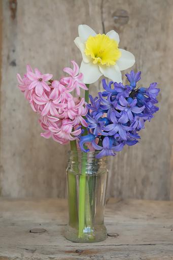 Keywords: flowers bouquet vase glass hyacinth narcissus yellow pink blue deco closeup spring flowers spring