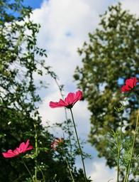 Keywords: flowers cosmos flowers cosmos pink garden green sky