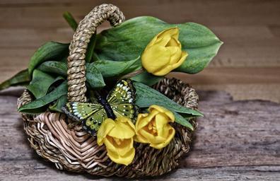 Keywords: flowers flower basket tulips yellow flowers yellow spring butterfly close