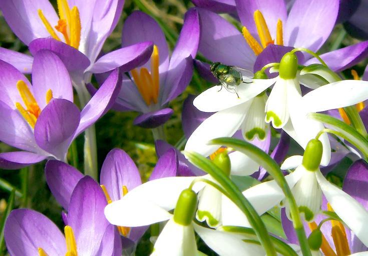 Keywords: flowers flower nature plant spring blossom bloom bloom color flora colorful purple violet snowdrop crocus sea of flowers flower fullness close fly insect animal macro green white harbinger of spring floral