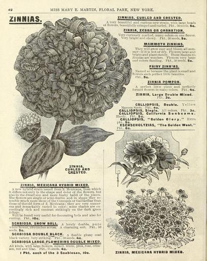 | Keywords: Flowers for springtime (16315415468).jpg 42 <br> MISS MARY E MARTIN FLORAL PARK NEW YORK <br> iiNNIAS <br> ZINNIAS CURLED AND CRESTED <br> curious new strain with large heads <br> 'imped and curled Pkt 50 seeds 5c <br> iJLW» ft ZgBRaj R OflR piflTmM <br> usly marked; many colors on one flower <br> iht and showy Pkt 50 seeds 5c <br> M ftWHj Of H Zl N N I as <br> They will grow easy and bloom all sum- <br> ler ” if it is wet or dry Flowers large and <br> right and plant stately These Mammoth <br> innias are wonders 'Flowers very large <br> nd colors dazzling Pkt 50 seeds 5c <br> FAIRY Zl W H ilS <br> Named so because the plant is small and <br> owers such perfect little beauties <br> Pkt 5c <br> ZINNIA POMPON <br> perfect little plant and perfectly <br> ted flowers in man v colors Pkt ftc <br> Z3K3IA La <br> as <br> Double Mixed <br> 3c <br> CALLiOPSES Double Yellow <br> Maroon Spots Pkt fte <br> CALLSOPSIS Single All colors Pkt 3c <br> CflLLIOPSIS California Sunbeams <br> Hardv Pkt 5c <br> CALLSOPSIS ©olden Glory Extra <br> pkt 5c <br> ESCHSCKGLTZIAS The Golden West <br> Pkt 6c <br> ZrNHSfi <br> CURLED AND <br> CJ ESTED <br> ZiaNia r MEXICANA HYBRID MIXE D <br> A newhybridstrain issued 'from Z Mexicana from which <br> it differs not only in the shape and color of the flowers but <br> also in the dwarf size and more bushy habit of the plants <br> The flowers are single or semi-double and in shape they re- <br> semble much more those of the Coreopsis or Gaillardias than <br> those of the old form of Z Mexicana; they are very numer- <br> ous and remarkably varied in color ; some shade9 are ex- <br> ceedingly rich and contrast strikingly on the dark green <br> foliage <br> Will be found very useful for decorating beds and also for <br> cutting Pkt IOc <br> SCABIOSA SNOW BALL A lovely double pure <br> white flower two inches across A charming sort Pkt 50 <br> seeds 5c <br> SCABIOSA DOUBLE BLACK A double glossy coa i <br> black variety very striking Pkt 50 seeds 4c <br> SCAB 1 OS A J A RG E-FL OWERING DOUBLE MSXED <br> All kinds with large flowers mixed white pink rose crim- <br> son red and lilac Pkt 75 seeds 4e <br> I Pkt each of the 3 Scabiosas IOc <br> ZINNIA MEXICANA HYBRID MIXED 43810182 149144 77948 Page 42 Text http //www biodiversitylibrary org/page/43810182 1900 Henry G Gilbert Nursery and Seed Trade Catalog Collection ; Miss Mary E Martin Firm ; Miss Mary E Martin Firm NameFound Coreopsis NameConfirmed Coreopsis L EOLID 38349 NameFound Scabiosa NameConfirmed Scabiosa 'Simon Greaves' EOLID 49101 NameFound Zinnia NameConfirmed Zinnia L EOLID 38874 Biodiversity Heritage Library Flowers for springtime Garden Stories Catalogs Flowers Miss Mary E Martin Firm Nurseries Horticulture Seeds U S Department of Agriculture National Agricultural Library bhl page 43810182 dc identifier http //biodiversitylibrary org/page/43810182 bhlGardenStories Zinnias BHLinbloom miss mary e martin firm nurseries horticulture u s department of agriculture national agricultural library bhlgardenstories bhlinbloom Information field Flickr posted date ISOdate 2015-02-11 CC-BY-2 0 BioDivLibrary https //flickr com/photos/61021753 N02/16315415468 2015-08-24 23 53 49 cc-by-2 0 PD-old-70-1923 Flowers for springtime Photos uploaded from Flickr by Fæ using a script Zinnia |
