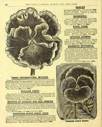 Keywords: Flowers for springtime (16477124646).jpg MARTIN FLORAL PARK NEW YORK <br> PANSIES <br> get close to your heart You can lore then <br> like little children They are so cunning <br> lifelike and pretty Clothed in natures <br> brightest and richest hues <br> NORMANP1E <br> These I lore best So many rich colors <br> such lovely shape Rich as velvet and <br> bright as Poppies They come from sunny <br> France You get 50 kinds and colors <br> Pkt 100 seeds IOc; 3 for 25c <br> ROYAL SHOW <br> These are lauded without stint by many <br> and thev truly make a Royal Show Colors <br> of Scarlet Plum and Royal Purple Blue and <br> Bronze Marbled Blotched and Giant <br> Striped Pkt 100 seeds IOc; 3 for 25c <br> IMPERIAL GERMAN <br> The favorite and most popular Pansies <br> raised in Germany Colors very bright <br> faultless form Highly praised by all Pkt <br> lOOseeds 6c;2for IOc; gOunce 25c <br> MAMMOTH BUTTERFLY <br> The flowers are very large of good form <br> and substance and produced freely In <br> coloring they are varied seldom two alike <br> in 100 plants They are mottled and spot- <br> ted streaked tigered and splashed while <br> the colors are mainly those rich wine-reds <br> chocolate velvety red-brown lavender vio- <br> let and purple shades which are only found <br> in a Pansy blossom <br> Per pkt of 100 seeds 8c; oz 35c <br> PANSY INTERNATIONAL MIXTURE <br> These are considered by the man who introduced them to be the <br> finest Pansies in the world ; in fact they are composed of <br> TlUhe molt famJus Pansies grown collected from France Ger- <br> many England Belgium and wherever fine tansies are grown <br> Some of this seed costs 30 00 an ounce This International Mix- <br> ture I buy direct from the originator <br> Pkt 100 seeds IOc; 3 for 25c <br> PARISIAN FANCY <br> These are the favorites of the gay Parisians and you can well <br> imagine they are pretty or they would not suit these people who <br> are luch lovers and judges of beauty Very large elegantly and <br> beautifullv marked These are a wonderful Pansy <br> Pkt 100 seeds 6c; 2 for IOc; V ounce 25c <br> MIXTURE OF SCARLET AND REP PANSIES <br> 'This is a mixture of special selections of Pansies with red I and <br> scarlet flowers made up of such varieties as Red Ridmghood <br> rardinal and Fierv Faces A bed of these Pansies presents a <br> striking and lS ul effect and will please every lover of this <br> favorite flower _ _ <br> Pkt 100 seeds 6c; 3 for 15c; jounce 25c <br> SUPERFINE MIXED PANSY SEEP <br> I want all my customers to try this charming mixture and have <br> reduced the price to induce all to try it You can't have too many <br> beautiful Pansies and I recommend buying seed by weight to be <br> able to make several planting of this mixture to insure plenty of <br> flowers always Pkt 100 seeds 3c; oz 12c; K oz 20c <br> PARISIAN FANCY PANSY 43810166 149144 77948 Page 26 Text http //www biodiversitylibrary org/page/43810166 1900 Henry G Gilbert Nursery and Seed Trade Catalog Collection ; Miss Mary E Martin Firm ; Miss Mary E Martin Firm Biodiversity Heritage Library Flowers for springtime Garden Stories Catalogs Flowers Miss Mary E Martin Firm Nurseries Horticulture Seeds U S Department of Agriculture National Agricultural Library bhl page 43810166 dc identifier http //biodiversitylibrary org/page/43810166 bhlGardenStories Pansy BHLinbloom miss mary e martin firm nurseries horticulture u s department of agriculture national agricultural library bhlgardenstories bhlinbloom Information field Flickr posted date ISOdate 2015-02-11 CC-BY-2 0 BioDivLibrary https //flickr com/photos/61021753 N02/16477124646 2015-08-24 23 51 51 cc-by-2 0 PD-old-70-1923 Flowers for springtime Photos uploaded from Flickr by Fæ using a script