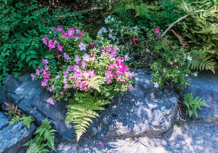 Keywords: flowers rock ferns plant nature landscape green outdoor pink sunny