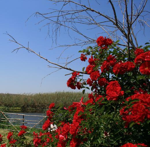 Keywords: flowers rose multiple bush dead branch tree foliage green sky blue
