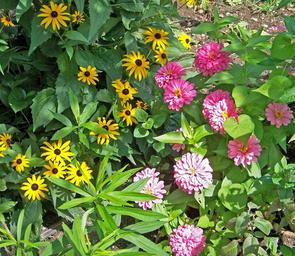 Keywords: flowers seasonal zinnia pink yellow floral blossom garden blooming season nature