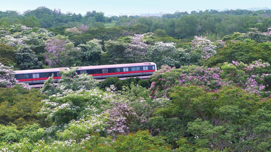 Keywords: flowers trees tabebuia rosea blossoms blooming nature park landscape track train green pink singapore