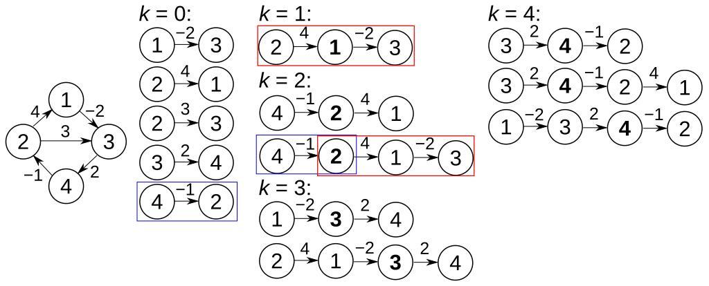 | Keywords: Floyd-Warshall example.svg en Demonstration of Floyd-Warshall algorithm for all-pairs shortest path on a directed graph with 4 vertices At k 0 prior to the first iteration of the outer loop the only known paths correspond to single edges in the original graph At k 1 paths that go through the vertex 1 are found in particular the path 2 1 3 is found replacing the path 2 3 which has less edges but is longer At k 2 paths going through the vertices 1 2 are found The red and blue boxes show how the path 4 2 1 3 is assembled from the known paths 4 2 and 2 1 3 encountered in previous iterations The path 4 †’2 †’3 is not considered because it is already known that 2 †’1 †’3 is the shortest path from 2 to 3 At k 3 paths going through the vertices 1 2 3 are found Finally at k 4 all shortest paths are found own User Dcoetzee 2012-12-17 Cc-zero Floyd-Warshall algorithm |