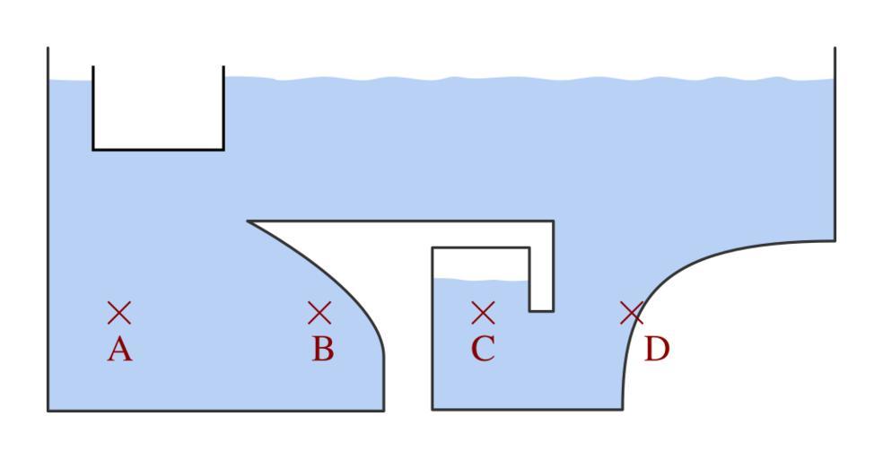 Keywords: Fluid statics, pressure depth dependence.svg en A simple diagram to illustrate the fact that in a static fluid pressure depends only on depth and not on the relative position of other bodies Thus here the pressure is identical at points A B C and D 2015-02 own Olivier Cleynen other versions cc-zero SVG physics Uploaded with UploadWizard Fluid statics |
