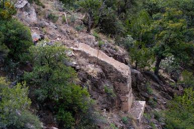 Keywords: arizona coconino national forest coconinonationalforest flume trail flumetrail forest service forestservice fossil creek fossilcreek fossil springs fossilsprings fossil springs wilderness fossilspringswilderness national forest nationalforest red rock ranger district redrockrangerdistrict tonto national forest tontonationalforest backpacking building canyon desert forest hiking historic outdoors spring springtime structure trail wilderness camp verde campverde united states unitedstates outdoor landscape mountainside plant tree Many old structures are left from the days the flume ran through the canyon diverting Fossil Creek's water to the Irving power plant. The Flume Trail starts at the old Irving Power Plant location and follows the line of the now-removed flume that carried the water from the dam to the power plants for generating electricity. The trail ends at the old Fossil Creek Dam, a four and a half mile trek one way. The trail ascends steadily about 500 feet from an elevation of 3769 foot at the trailhead over the first mile. For the next three and a half miles, the trail rolls gently several times in approximately 150 foot elevation changes before arriving at the dam. The trail is approximately 500 feet up the side of the canyon, offering fantastic views of the canyon and creek below. There is no creek acccess between the trailhead and the dam. The trail is very exposed and extremely hot in the warmer months. Hikers should carry at least four quarts of water. The trail is in the Fossil Creek Wilderness. Bikes and mechanized vehicles are prohibited. Camping is prohibited along Flume Trail, from the Fossil Creek Dam for several miles downstream (west) along the canyon. Flume Trail meets Fossil Springs Trail at the old dam. Continue another half mile through a narrow section of the canyon to find easy camping near the creek in the springs area. Camping is permitted during the fall-winter season 100 feet or more from the creek. A half mile from the dam is a marked side trail leading to the first spring source, where many hikers choose to refill their water bottles. Fossil Creek is one of two Wild and Scenic rivers in Arizona. A series of springs gush 20,000 gallons a minute year-round at the bottom of a 1,600 foot deep canyon, creating a lush riparian oasis rich with life. Over the years these calcium laden waters have laid down huge deposits of a type of limestone called travertine, creating deep pools for miles along the creek. The Wilderness and surrounding area are on the Tonto and Coconino National Forests, and are managed by the Coconino National Forest. During the spring-summer season, camping is prohibited anywhere in the Wilderness and surrounding area, and a reserved parking permit is required to park at the Flume trailhead at the Irving parking lot. See Flume Trail and Fossil Creek on the USFS Coconino National Forest website Photo by Deborah Lee Soltesz, March 11, 2016. Source: USFS Coconino National Forest. Many old structures are left from the days the flume ran through the canyon diverting Fossil Creek's water to the Irving power plant. The Flume Trail starts at the old Irving Power Plant location and follows the line of the now-removed flume that carried the water from the dam to the power plants for generating electricity. The trail ends at the old Fossil Creek Dam, a four and a half mile trek one way. The trail ascends steadily about 500 feet from an elevation of 3769 foot at the trailhead over the first mile. For the next three and a half miles, the trail rolls gently several times in approximately 150 foot elevation changes before arriving at the dam. The trail is approximately 500 feet up the side of the canyon, offering fantastic views of the canyon and creek below. There is no creek acccess between the trailhead and the dam. The trail is very exposed and extremely hot in the warmer months. Hikers should carry at least four quarts of water. The trail is in the Fossil Creek Wilderness. Bikes and mechanized vehicles are prohibited. Camping is prohibited along Flume Trail, from the Fossil Creek Dam for several miles downstream (west) along the canyon. Flume Trail meets Fossil Springs Trail at the old dam. Continue another half mile through a narrow section of the canyon to find easy camping near the creek in the springs area. Camping is permitted during the fall-winter season 100 feet or more from the creek. A half mile from the dam is a marked side trail leading to the first spring source, where many hikers choose to refill their water bottles. Fossil Creek is one of two Wild and Scenic rivers in Arizona. A series of springs gush 20,000 gallons a minute year-round at the bottom of a 1,600 foot deep canyon, creating a lush riparian oasis rich with life. Over the years these calcium laden waters have laid down huge deposits of a type of limestone called travertine, creating deep pools for miles along the creek. The Wilderness and surrounding area are on the Tonto and Coconino National Forests, and are managed by the Coconino National Forest. During the spring-summer season, camping is prohibited anywhere in the Wilderness and surrounding area, and a reserved parking permit is required to park at the Flume trailhead at the Irving parking lot. See Flume Trail and Fossil Creek on the USFS Coconino National Forest website Photo by Deborah Lee Soltesz, March 11, 2016. Source: USFS Coconino National Forest.