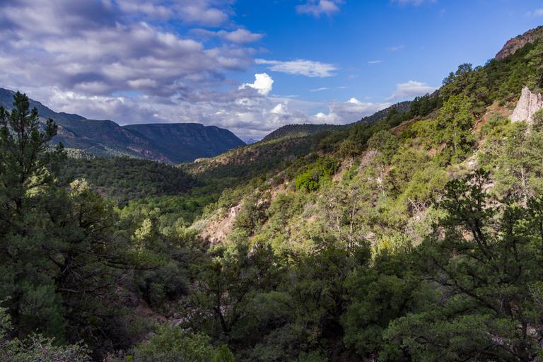| Keywords: arizona coconino national forest coconinonationalforest flume trail flumetrail forest service forestservice fossil creek fossilcreek fossil springs fossilsprings fossil springs wilderness fossilspringswilderness national forest nationalforest pentax k-1 pentaxk1 red rock ranger district redrockrangerdistrict tonto national forest tontonationalforest usfs canyon desert forest hiking outdoors riparian summer wilderness strawberry outdoor hill landscape mountainside foothill ridge mountain mountain ridge cliff crag The Flume Trail starts at the old Irving Power Plant location and follows the line of the now-removed flume that carried the water from the dam to the power plants for generating electricity. The trail ends at the old Fossil Creek Dam, a four and a half mile trek one way. The trail ascends steadily about 500 feet from an elevation of 3769 foot at the trailhead over the first mile. For the next three and a half miles, the trail rolls gently several times in approximately 150 foot elevation changes before arriving at the dam. The trail is approximately 500 feet up the side of the canyon, offering fantastic views of the canyon and creek below. There is no creek access between the trailhead and the dam. The trail is very exposed and extremely hot in the warmer months. Hikers should carry at least four quarts of water. The trail is in the Fossil Creek Wilderness. Bikes and mechanized vehicles are prohibited. Flume Trail ends at the old Fossil Creek Dam, where the trail joins with Fossil Springs Trail. Camping is prohibited along Flume Trail, from the Fossil Creek Dam for several miles downstream (west) along the canyon to the bridge. Flume Trail meets Fossil Springs Trail at the old dam. Continue another half mile on Fossil Springs Trail through a narrow section of the canyon to find easy camping near the creek in the springs area. Camping is permitted during the fall-winter season 100 feet or more from the creek. A half a mile from the dam is a marked side trail leading to the first spring source, where many hikers refill their water bottles. Fossil Creek is one of two Wild and Scenic rivers in Arizona. A series of springs gush 20,000 gallons a minute year-round at the bottom of a 1,600 foot deep canyon, creating a lush riparian oasis rich with life. Over the years these calcium laden waters have laid down huge deposits of a type of limestone called travertine, creating deep pools for miles along the creek. The Wilderness and surrounding area are on the Tonto and Coconino National Forests, and are managed by the Coconino National Forest. During the spring-summer season, camping is prohibited anywhere in the Wilderness and surrounding area, and a reserved parking permit is required to park at the Flume trailhead at the Irving parking lot. See Flume Trail and Fossil Creek on the USFS Coconino National Forest website for maps, regulations, permit reservations, and other details. Photo by Deborah Lee Soltesz, August 10, 2016. Source: USFS Coconino National Forest. The Flume Trail starts at the old Irving Power Plant location and follows the line of the now-removed flume that carried the water from the dam to the power plants for generating electricity. The trail ends at the old Fossil Creek Dam, a four and a half mile trek one way. The trail ascends steadily about 500 feet from an elevation of 3769 foot at the trailhead over the first mile. For the next three and a half miles, the trail rolls gently several times in approximately 150 foot elevation changes before arriving at the dam. The trail is approximately 500 feet up the side of the canyon, offering fantastic views of the canyon and creek below. There is no creek access between the trailhead and the dam. The trail is very exposed and extremely hot in the warmer months. Hikers should carry at least four quarts of water. The trail is in the Fossil Creek Wilderness. Bikes and mechanized vehicles are prohibited. Flume Trail ends at the old Fossil Creek Dam, where the trail joins with Fossil Springs Trail. Camping is prohibited along Flume Trail, from the Fossil Creek Dam for several miles downstream (west) along the canyon to the bridge. Flume Trail meets Fossil Springs Trail at the old dam. Continue another half mile on Fossil Springs Trail through a narrow section of the canyon to find easy camping near the creek in the springs area. Camping is permitted during the fall-winter season 100 feet or more from the creek. A half a mile from the dam is a marked side trail leading to the first spring source, where many hikers refill their water bottles. Fossil Creek is one of two Wild and Scenic rivers in Arizona. A series of springs gush 20,000 gallons a minute year-round at the bottom of a 1,600 foot deep canyon, creating a lush riparian oasis rich with life. Over the years these calcium laden waters have laid down huge deposits of a type of limestone called travertine, creating deep pools for miles along the creek. The Wilderness and surrounding area are on the Tonto and Coconino National Forests, and are managed by the Coconino National Forest. During the spring-summer season, camping is prohibited anywhere in the Wilderness and surrounding area, and a reserved parking permit is required to park at the Flume trailhead at the Irving parking lot. See Flume Trail and Fossil Creek on the USFS Coconino National Forest website for maps, regulations, permit reservations, and other details. Photo by Deborah Lee Soltesz, August 10, 2016. Source: USFS Coconino National Forest. |