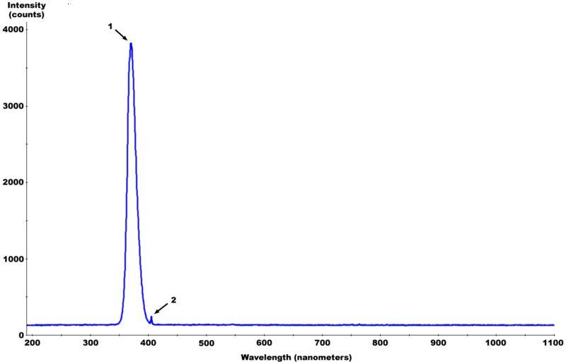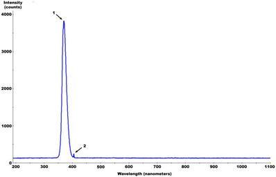 | Keywords: Fluorescent Black-Light spectrum with peaks labelled.gif Image uploaded in en wikipedia org into the Public Domain by en user Deglr6328 on 7 Oct 2005 Original summary Spectrum of light from a fluorescent black light with peaks labelled The spectrum was taken with an Ocean Optics HR2000 spectrometer http //www oceanoptics com The spectrometer used appears to be about ~ 3 to 8 nm off judging from the location of known peaks Fluorescent black lights are usually made the same way as regular Wikipedia fluorescent lamps except the clear glass used in normal fluorescent lights is replaced with Wood's glass which is a glass that has been doped with nickel oxide making it a deep blue/purple color and blocking virtually all visible light above ~400 nm Also the phosphor used on the inner surface of the tube differs from the typical multi phosphor blend used in normal fluorescent lights to produce visible light and in black lights is either europium doped strontium fluoroborate or europium doped strontium tetraborate to produce a peak near 370nm as in this lamp or a lead doped barium silicate to produce a peak near 351 nanometers The phosphor fluoresces due to irradiation by short-wave ultraviolet light UV-C produced by mercury vapor in the tube A small amount of the violet light produced by the 404 nm mercury spectral line leaks through the glass filter causing the second small peak at 404 nm More info http //www uvsystems com/articles/LW_UV_Sources_for_Mineral_Collectors pdf Spectrum taken by me wikitable Peak number Wavelength of peak nm Species producing peak Actual line location nm - 1 370 europium doped strontium tetraborate ~370 - 2 405 mercury 404 656 Deglr6328 graph Spectral power distribution Fluorescence Black light |