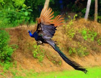 | Keywords: Flying Beauty Peacock.JPG In a morning I hear the voice of peacock from my Home then i take my camera and went to saw peacock then i find a peacock on a palm tree it doesn't have any feather But it is also beautiful so i click some snaps At that time i hear some leaf sound when i turned OMG I am just woww to saw the beautiful bird ran in front of my eye its feather gently wave in the floor then i turned my camera to his beauty and got my dream Click own 10th june 2015 Soumya B Own Work Birds in flight Pavo cristatus |