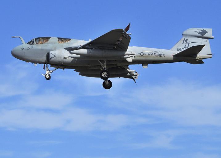 | Keywords: Flying in Souda Bay DVIDS249485.jpg en An EA-6B Prowler assigned to Marine Tactical Electronic Warfare Squadron 3 makes its final approach for landing on Greece's largest island of Crete for a transient stopover The Moon Dogs of VMAQ 3 are based at Marine Corps Air Station Cherry Point North Carolina with a mission of supporting the Marine Air-Ground Task Force commander by conducting airborne electronic warfare day or night under all weather conditions during expeditionary joint or combined operations 2010-02-01 D L Paul Farley https //www dvidshub net/image/249485 100201-N-+++++-001 2010-02-09 15 23 SOUDA BAY GR PD-USGov-Military-Navy Marine Corps Air Station Cherry Point EA-6B Prowler US Marine Corps Images from DoD uploaded by Fæ |