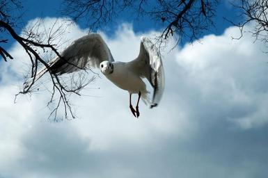 Keywords: flying seagull feathered animal bird sea bird ocean sky clouds tree branch